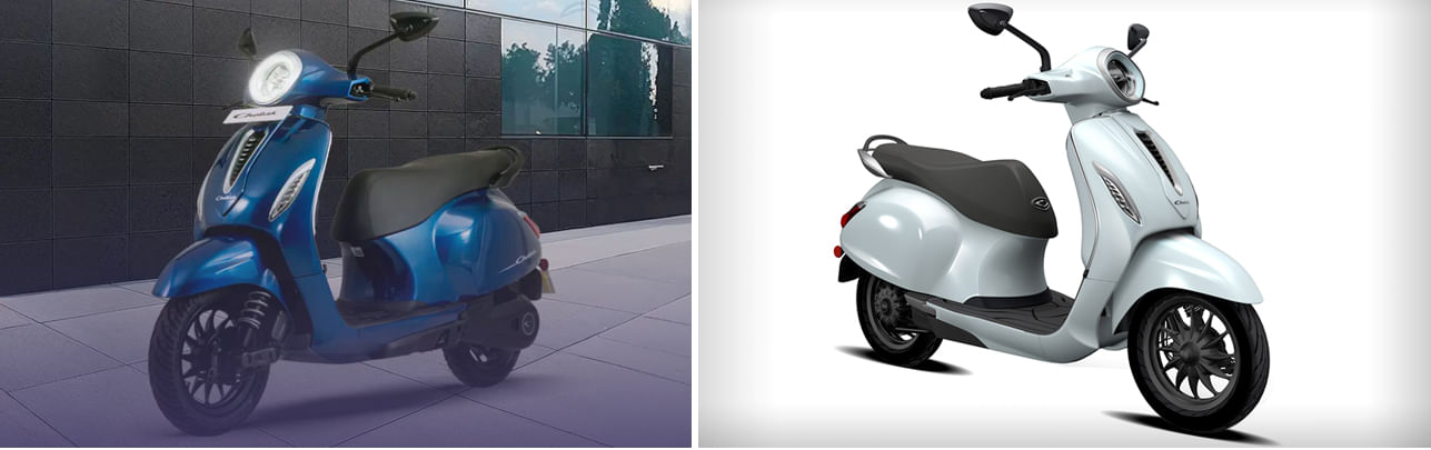 Left: The Chetak 3503, priced at Rs 110,000 is the most affordable Bajaj EV on two wheels. Right: The Chetak Urbane continues to witness strong demand.