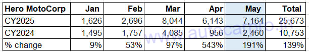 Hero MotoCorp has sold 7,164 Vida 2 e-scooters in May, up 191% YoY on its year-ago base of 2,460 units. This performance sees its e-2W share more than double to 7% from 3% a year ago. This is the company’s third highest monthly sales after March 2025 (7,982 units) and October 2024 (7,355 units).
