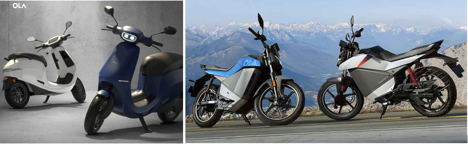 The S1 range of e-scooters forms the bulk of Ola’s sales. Right: Deliveries of the Roadster X electric motorcycle have begun.